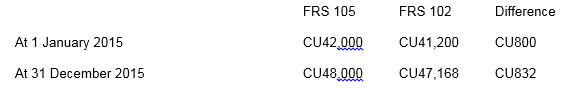 The amount that should have been recognised as revenue under FRS 105 is the cash price of CU36,000 which is as per FRS 102. The difference between the CU54,000 and the CU36,000 (i.e. CU18,000) should be recognised on a straight line basis (i.e. CU18,000/3 years= CU6,000) as interest income over the 3 year credit period. Therefore the required debtor balance under FRS 105 at the date of transition/1 January 2015 is CU42,000 (CU36,000+CU6,000), the 31 December 2015 is CU48,000 (CU42,000+CU6,000) and the 31 December 2016 is CUNil. Assume a corporation tax rate of 10%.