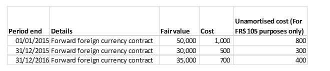 As FRS 105 does not permit fair valuing of derivatives an adjustment is required on transition to restate it to unamortised cost. FRS 105 does require disclosure of these forward contracts in the financial statements. Assume the corporation tax rate is 10% and hedge accounting was not applied under FRS 102.
