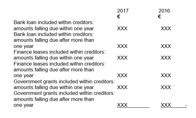 iv) An amount of €XX (2016:€XX) was included in creditors with regard to finance leases where security is held by the provider of those leases. CUXXX of this liability is included within creditors: amounts falling due within one year and CUXX included within creditors: amounts falling due after more than one year
