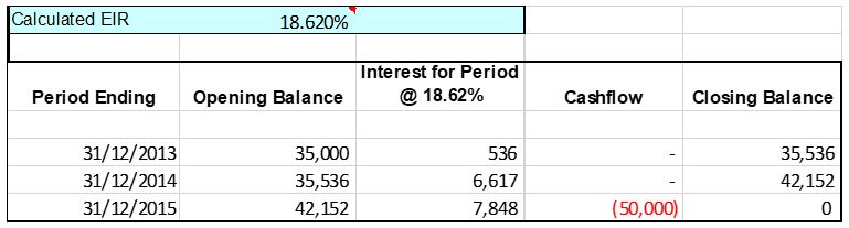 Company A sold goods worth CU50,000 with unusual credit terms on 01/12/13. The credit provided is for a period of up to 31/12/15. The normal cash price for these goods would be CU35,000. The difference of CU15,000 is determined to be a financing transaction. The effective interest rate is calculated at 18.62% as per below. The effective interest rate is determined so as to write the deemed interest into the P&L over the life of the transaction. The effective interest rate is determined through trial and error or through the use of Excel. If the cash price was not known then you have to present value the amount at a market rate of interest.