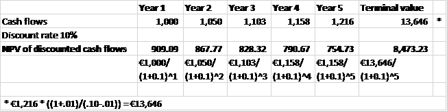 For example, Company A prepared a cash flow for impairment testing purposes based on budgets for years 1 to 5. The assumed discount rate is 10% and the terminal value growth rate is 1%. The projected cash flow including discounting is as per below.